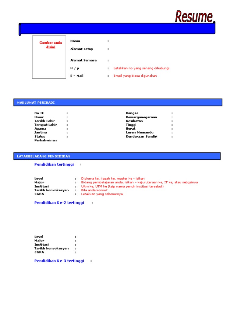 Biasanyakita perlu menulis resume untuk memohon perkerjaan dan selalunya anda diminta untuk menulis resume dalam EnglishTetapi jika anda minta untuk menulis resume dalam bahasa melayu anda boleh gunakan contoh resume dibawah ini. January 26 2021 by upnd. Anda telah memuat-turun templat resume kami dan membaca panduan.